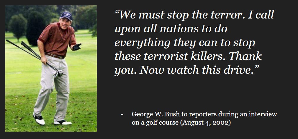 In response to the attacks of September 11, 2001, George W. Bush opened up a world-altering Global War on Terror that cost $6 trillion and counting, and destroyed 900,000+ lives.