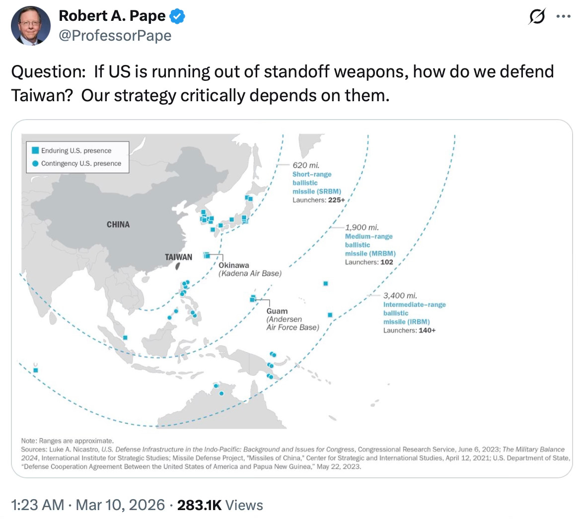 Fallacious on so many levels. The US does have a serious munitions problem. It is militarily overstretched. And the US can’t win a war with China over Taiwan.