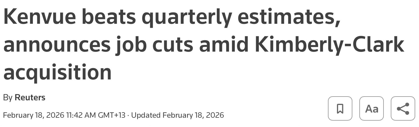 The toilet paper warehouse was owned by a firm called Kimberly-Clark, which produces toilet paper, Huggies, Kleenex, Q-Tips, Depends, and on and on. Last November, Kimberley-Clark committed $40 billion to acquire Kenvue, a similar health-products company, promising in the same press statement to reduce its 22k-person workforce by 3.5%.