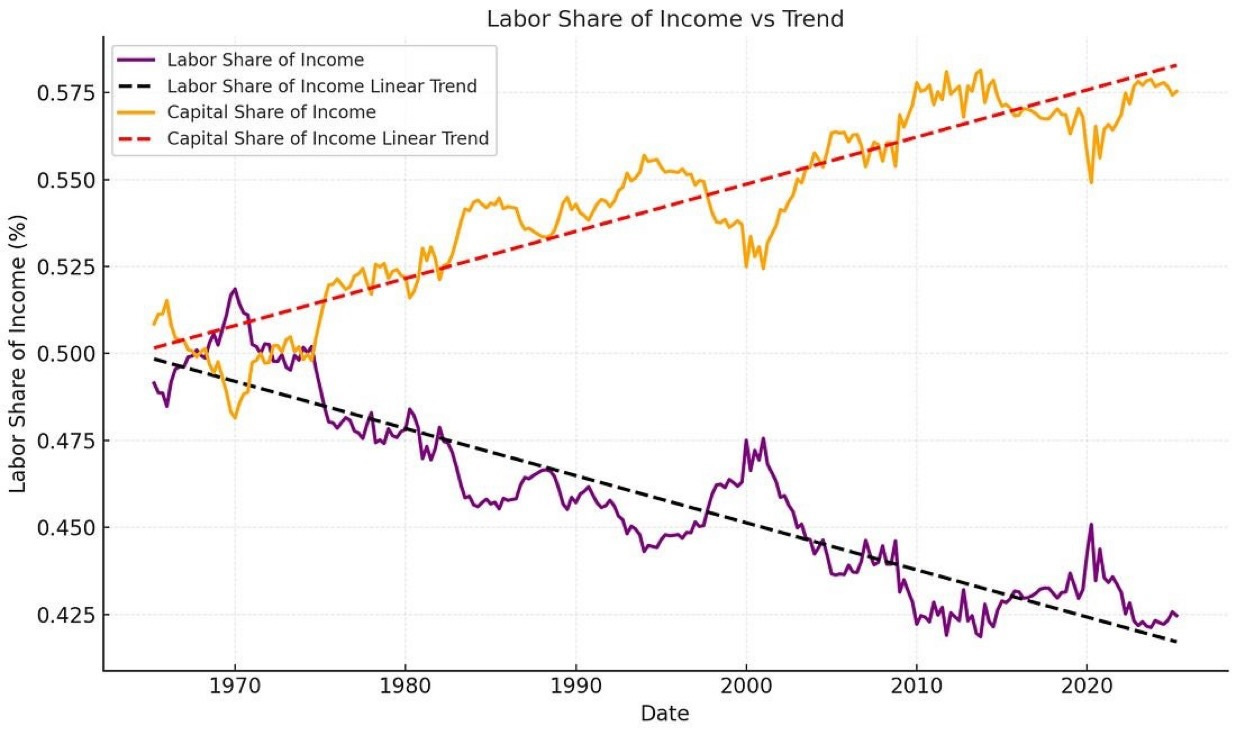 This is all normal capitalism shit! But it’s not happening in a vacuum. Ever heard of the K-shaped economy? Since the dawning of the neoliberal era in the 1970s, capital’s share of national income has grown at the expense of labor’s share of national income. Many scholars have pronounced neoliberalism a dead doctrine since 2020, but the share of income going to workers is at its lowest in 50+ years: