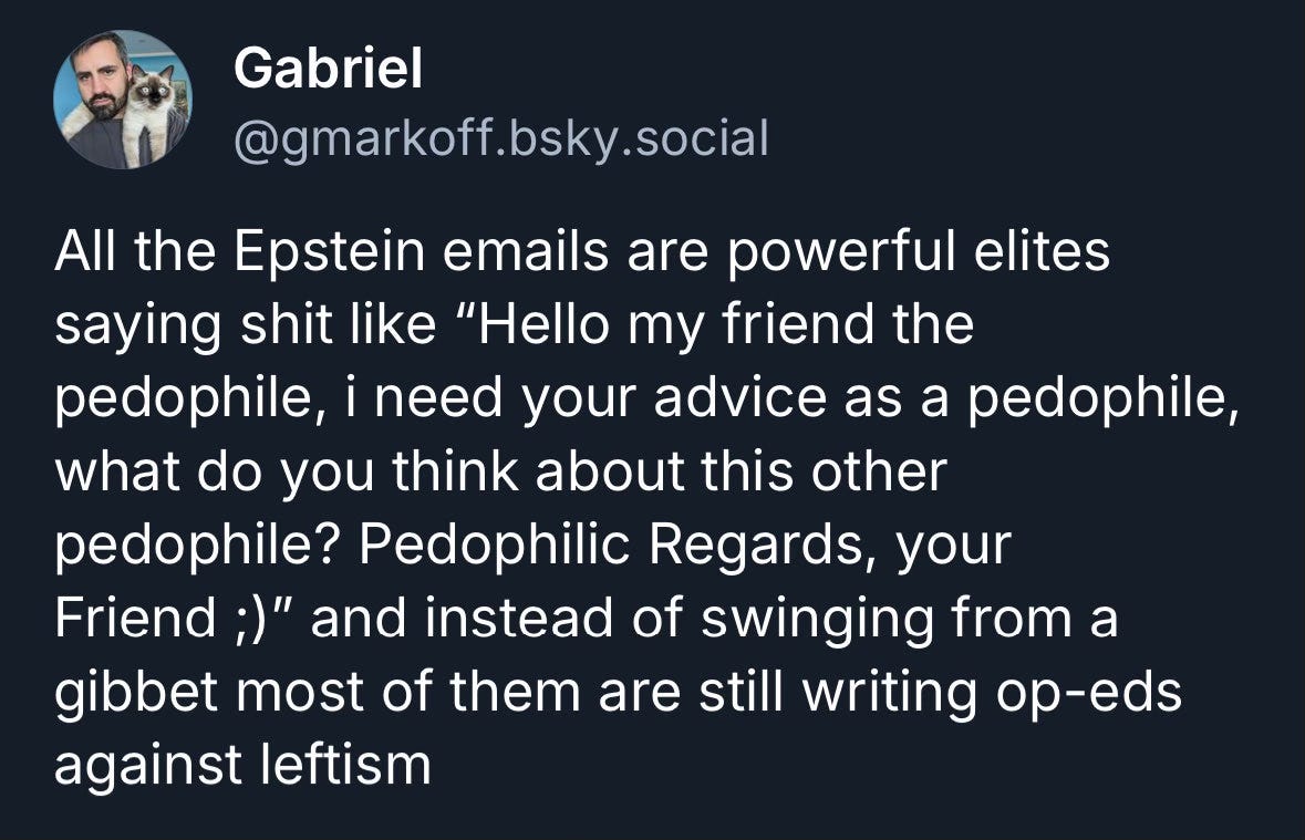 I’ve written about the Jeffrey Epstein bombshells twice this week, not because I want to, but because I have a take that situates all of it within larger critiques of world politics that I’m just not really seeing in coverage elsewhere. I was also one of these people who blew off all the initial Jeffrey Epstein conspiracy theories as anti-semitic—and they might well have been—but the tranche of leaked emails validates all the worst conspiracies that used to be in circulation.