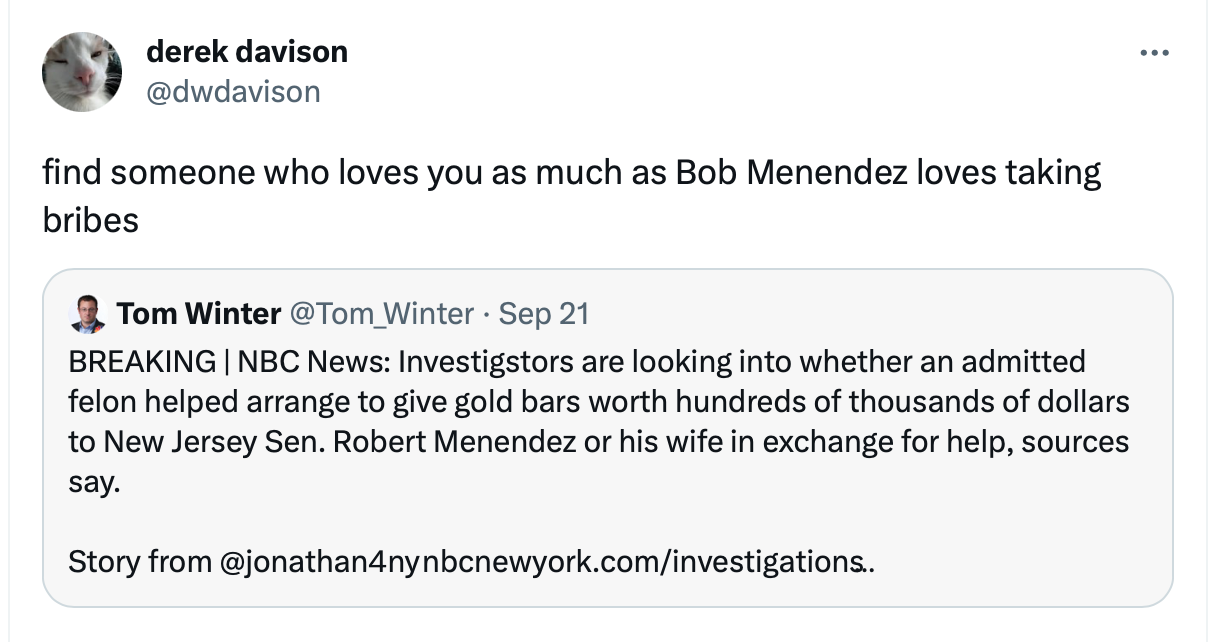 JFC, the Bob Menendez story, man. Who among us hasn’t traded political favors for…gold bars!? 🤣🤣🤣