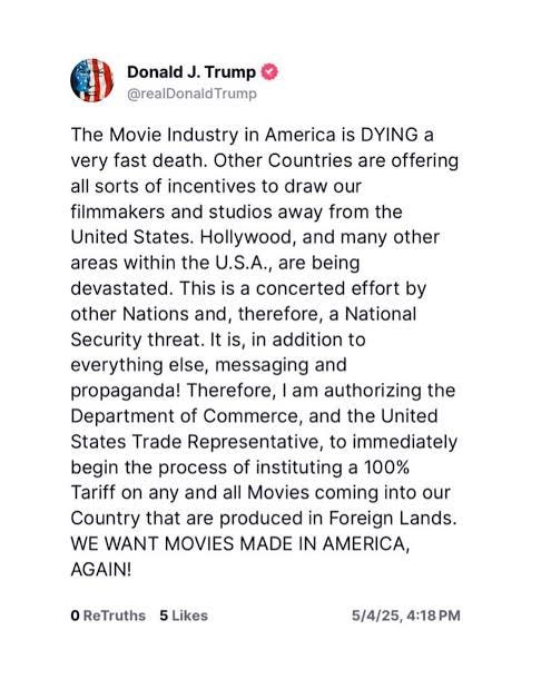Hollywood drew my attention last week in two ways—one catastrophic, one hopeful. First, the catastrophic: Trump has announced 100% tariffs on foreign movies.
